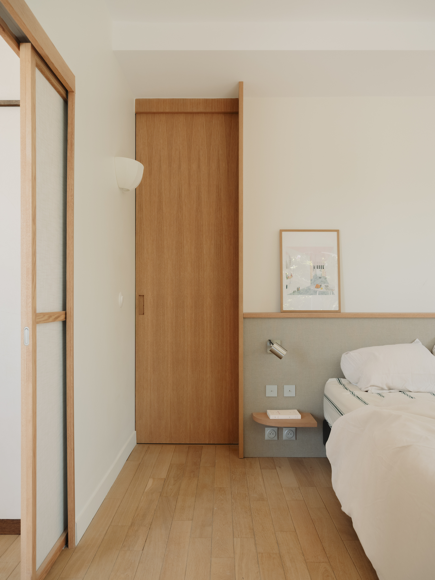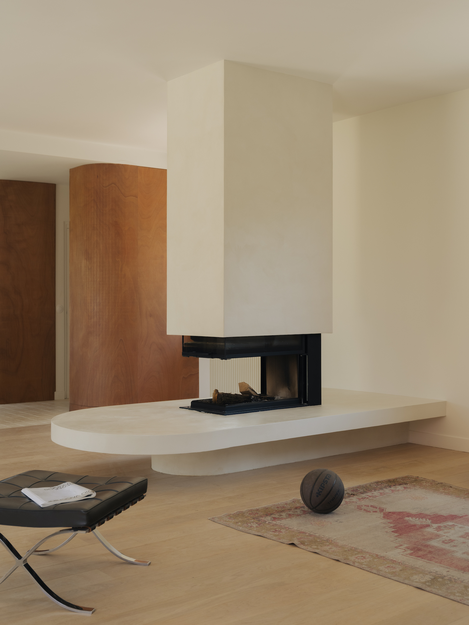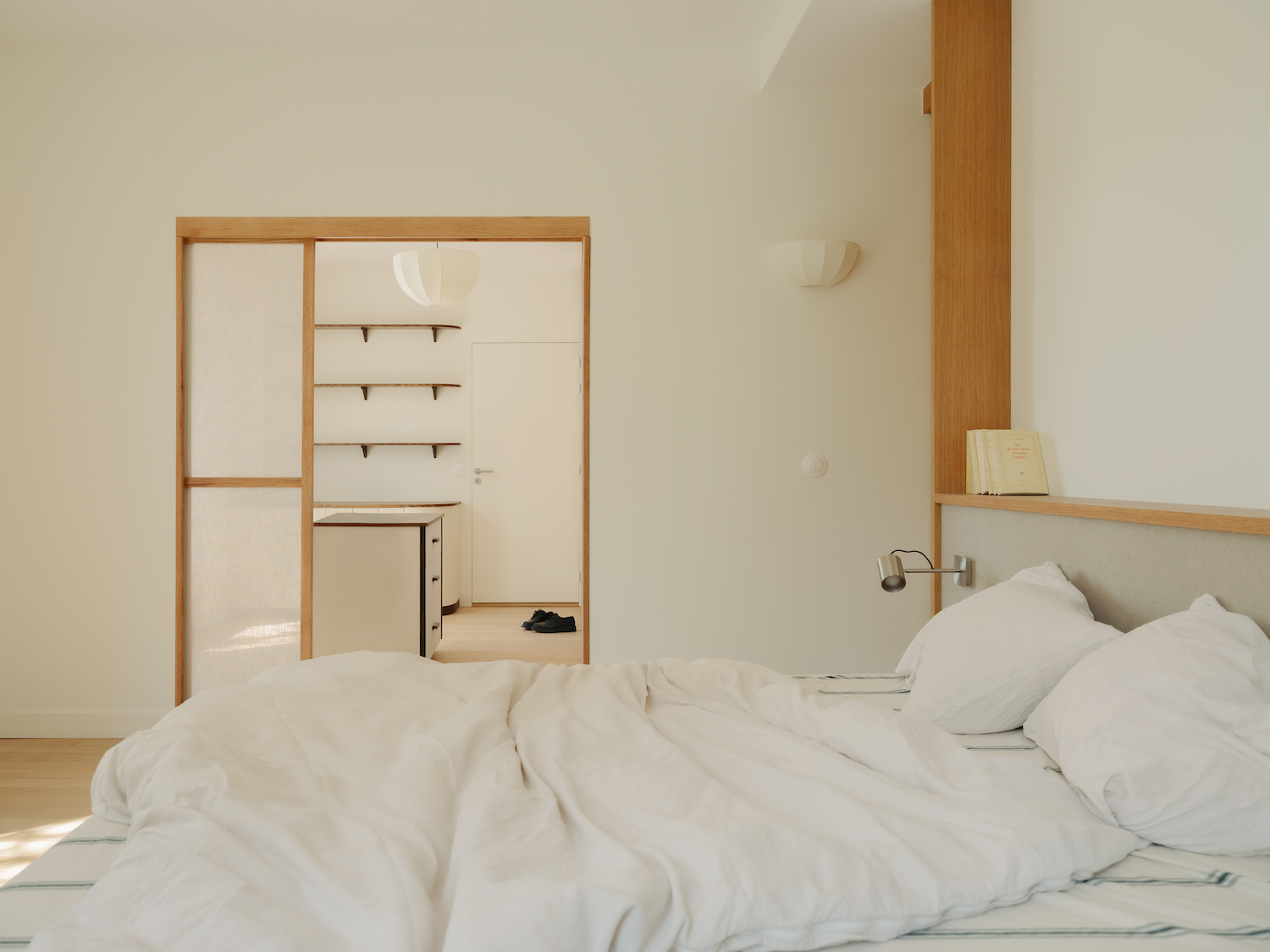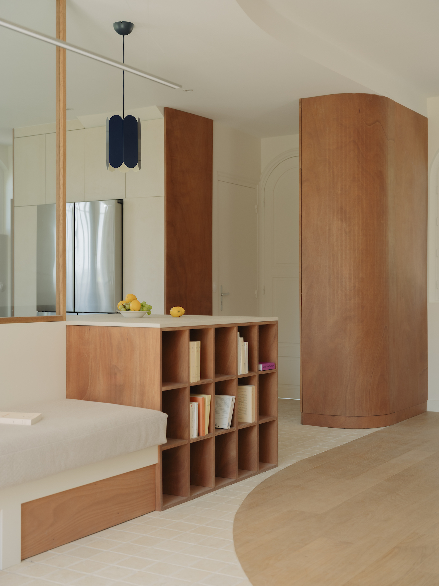 Material choices further define these shifts with wood flooring anchoring the living room, while stone distinguishes the kitchen, establishing a contrast that is echoed in a curved dropped ceiling overhead. This choice not only emphasizes the transition between zones but also allows for differentiated lighting conditions within each space. Meanwhile, the primary suite is designed as a dual environment, where the bedroom and dressing area are combined into a single, open volume, while the bathroom is discreetly positioned behind the headboard. Sliding elements introduce flexibility throughout, including a wood and linen panel that filters light between spaces and a full-height wooden door that leads into a bathroom entirely clad in ceramic. Here, tiled surfaces extend across walls, bathtub, and vanity, creating a unified, mineral-like interior that feels immersive and tactile.