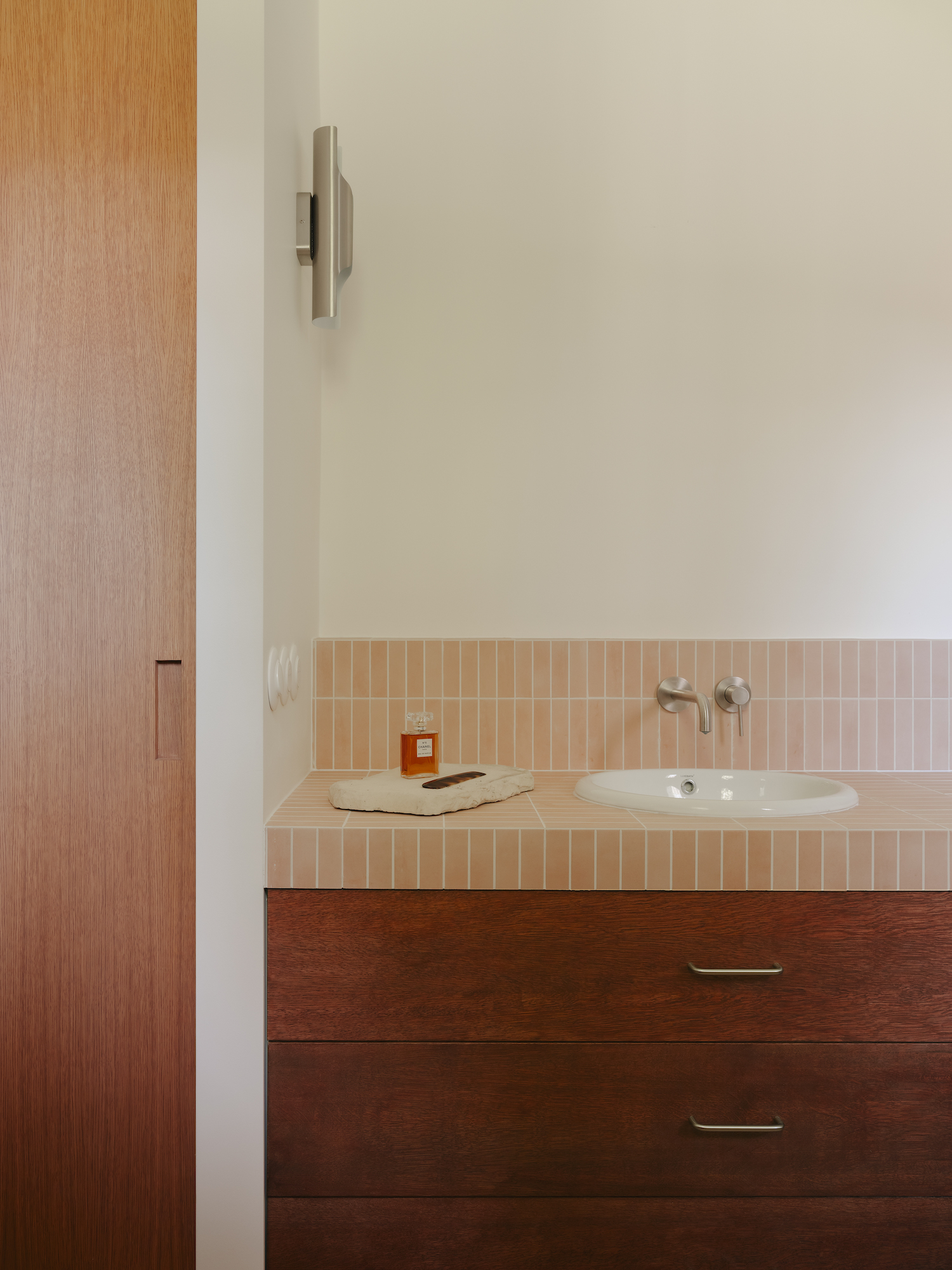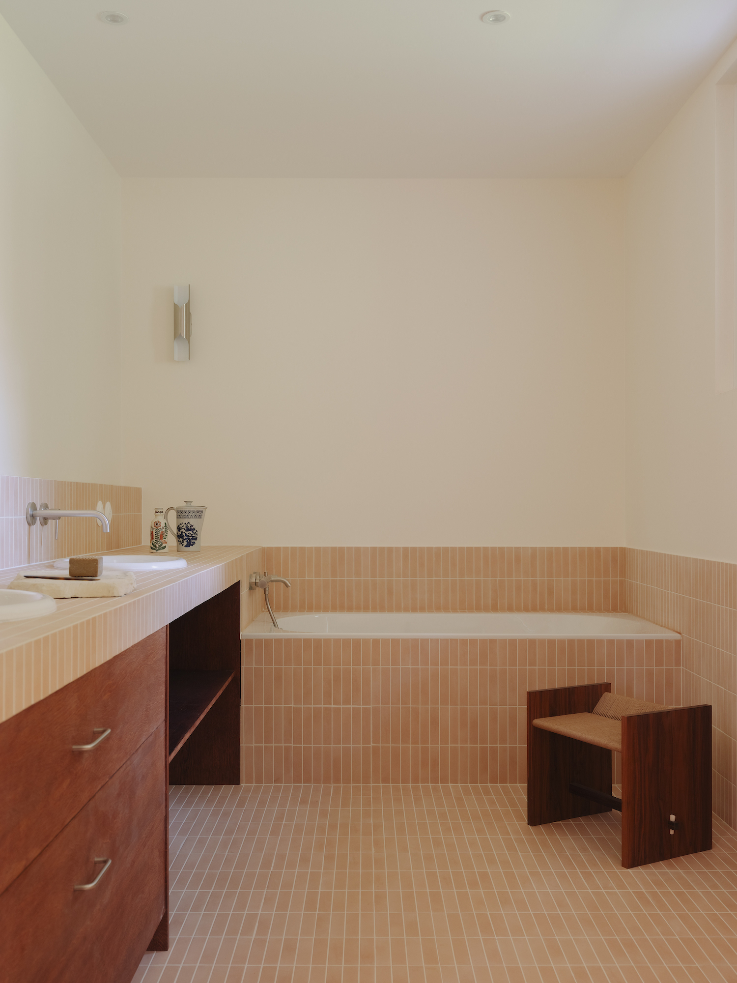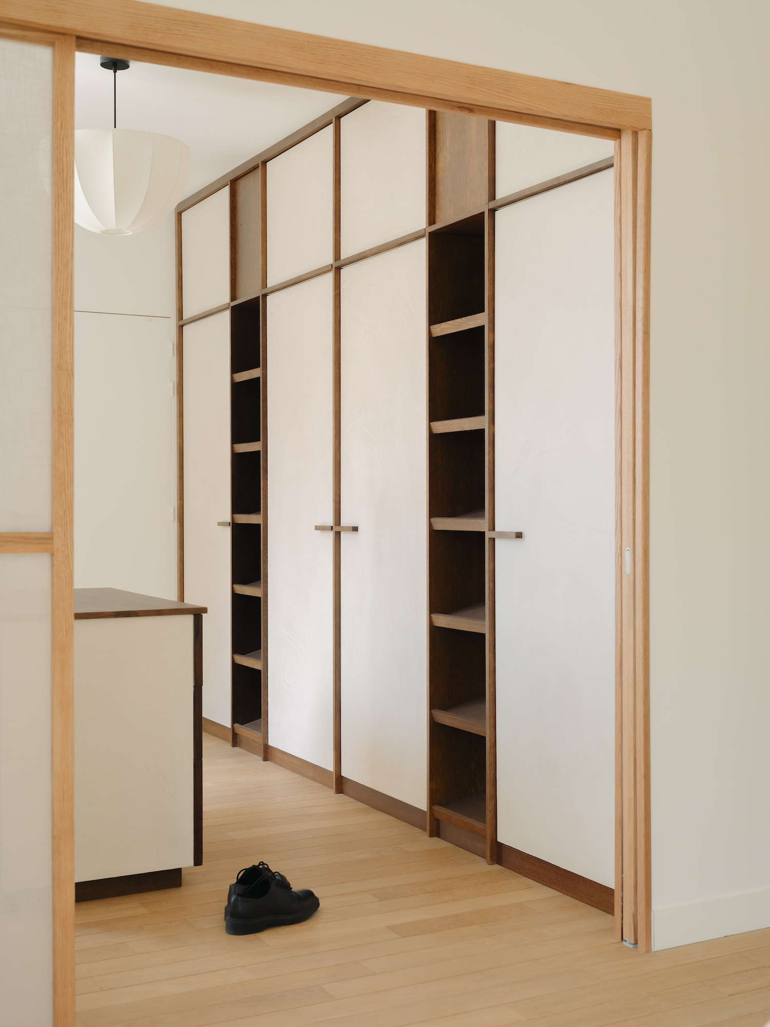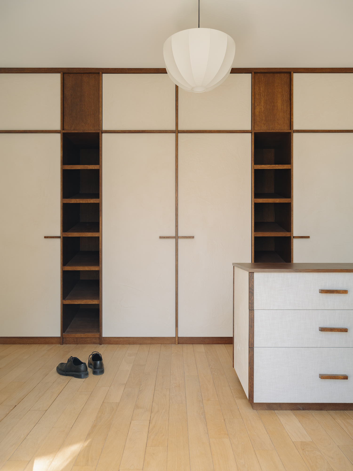 Material choices further define these shifts with wood flooring anchoring the living room, while stone distinguishes the kitchen, establishing a contrast that is echoed in a curved dropped ceiling overhead. This choice not only emphasizes the transition between zones but also allows for differentiated lighting conditions within each space. Meanwhile, the primary suite is designed as a dual environment, where the bedroom and dressing area are combined into a single, open volume, while the bathroom is discreetly positioned behind the headboard. Sliding elements introduce flexibility throughout, including a wood and linen panel that filters light between spaces and a full-height wooden door that leads into a bathroom entirely clad in ceramic. Here, tiled surfaces extend across walls, bathtub, and vanity, creating a unified, mineral-like interior that feels immersive and tactile.