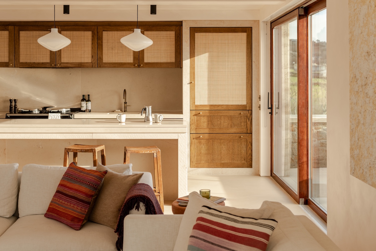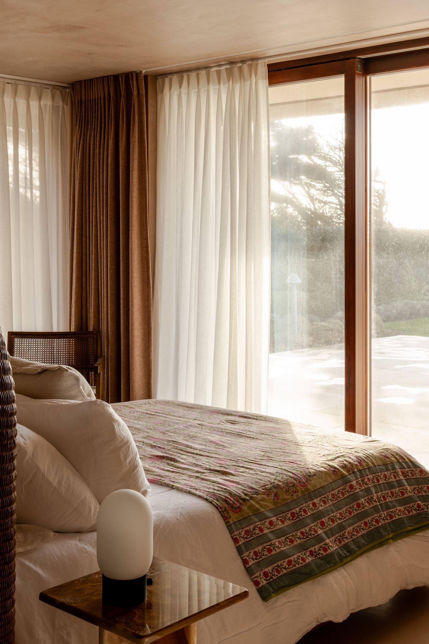 The most sophisticated gesture involves material hybridization. Fieldwork ground local Jersey granite – distinguished by its characteristic pink tone – into fine dust, then mixed it into the stabilized rammed earth aggregate. This custom composite required extensive research and iterative testing with Rammed Earth Structures and Elliott Wood, progressing from small samples to full-scale application. The result pulls the granite’s delicate coloration into the wall’s structure while achieving precise textural and tonal finish. Where the earthen core remains exposed at the home’s center, it functions simultaneously as construction documentation and sculptural focal point, celebrating the labor-intensive process that produced it.