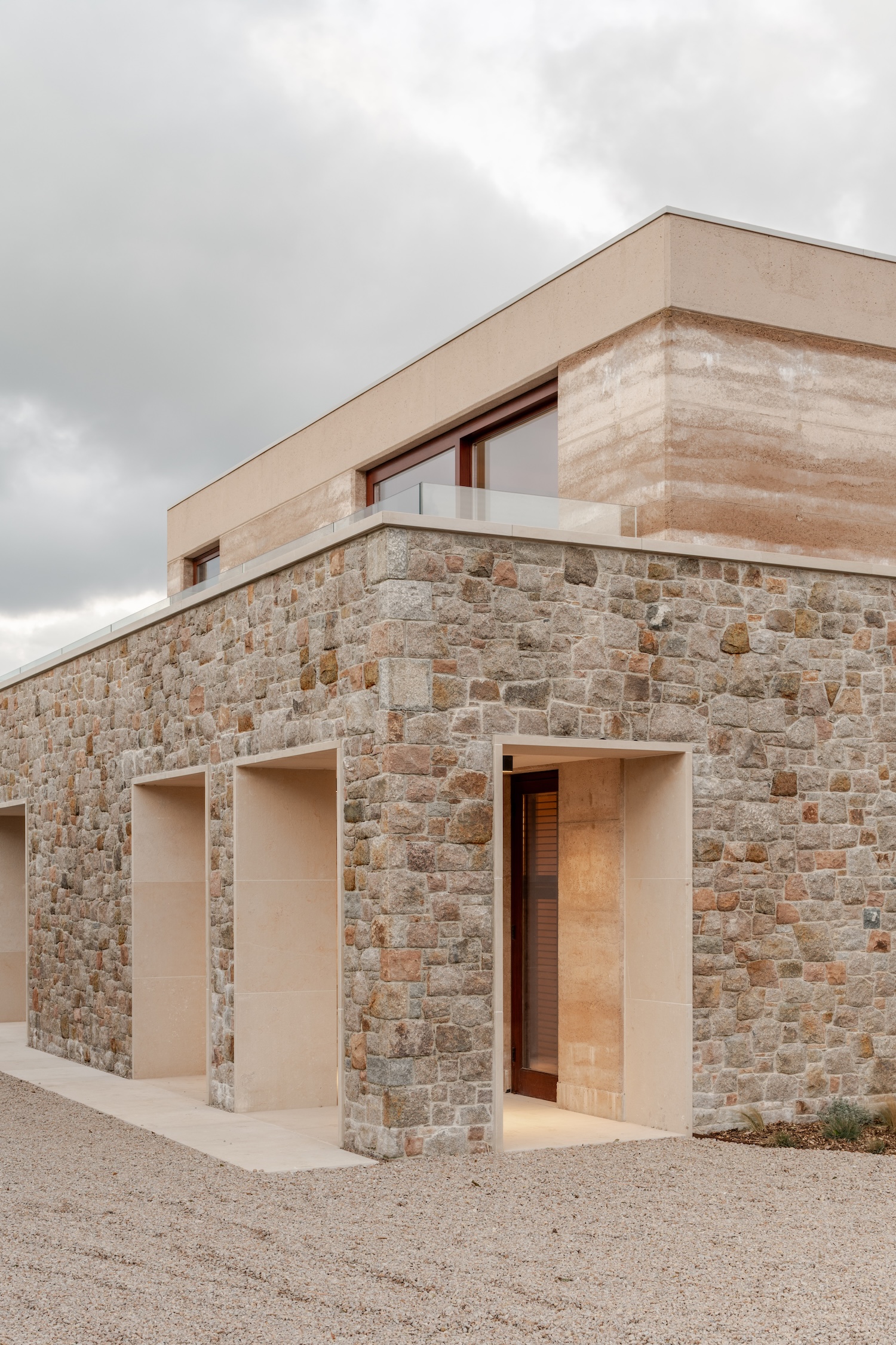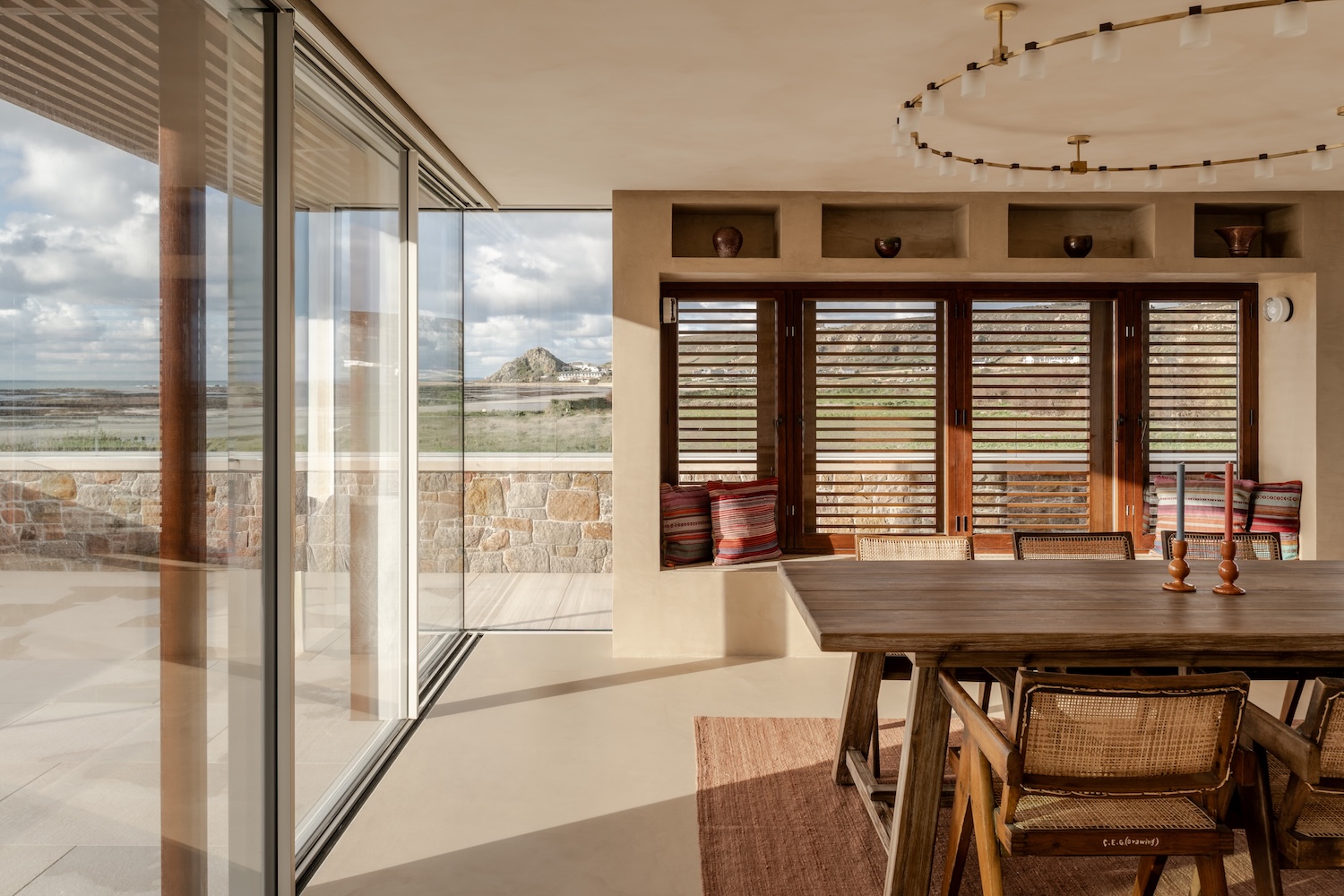 Material selection operates at the intersection of performance and place. The rammed earth wall addresses Jersey’s climatic extremes through inherent thermal mass, moderating temperature swings between summer heat and damp winter cold. At ground level, local granite wraps the earthen core, forming a protective layer against Atlantic turbulence while establishing a colonnade along two elevations. This covered terrace mediates between interior shelter and landscape exposure, creating transitional space that acknowledges the coast’s volatile weather patterns.
