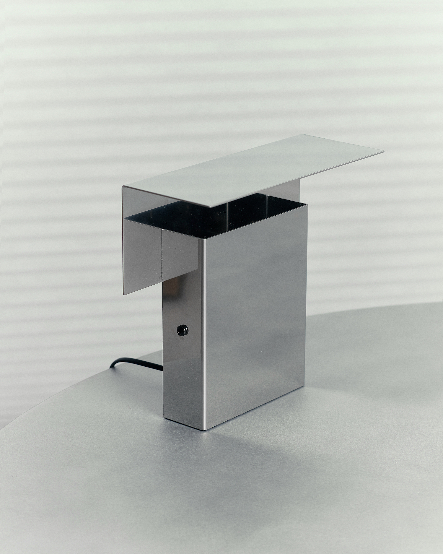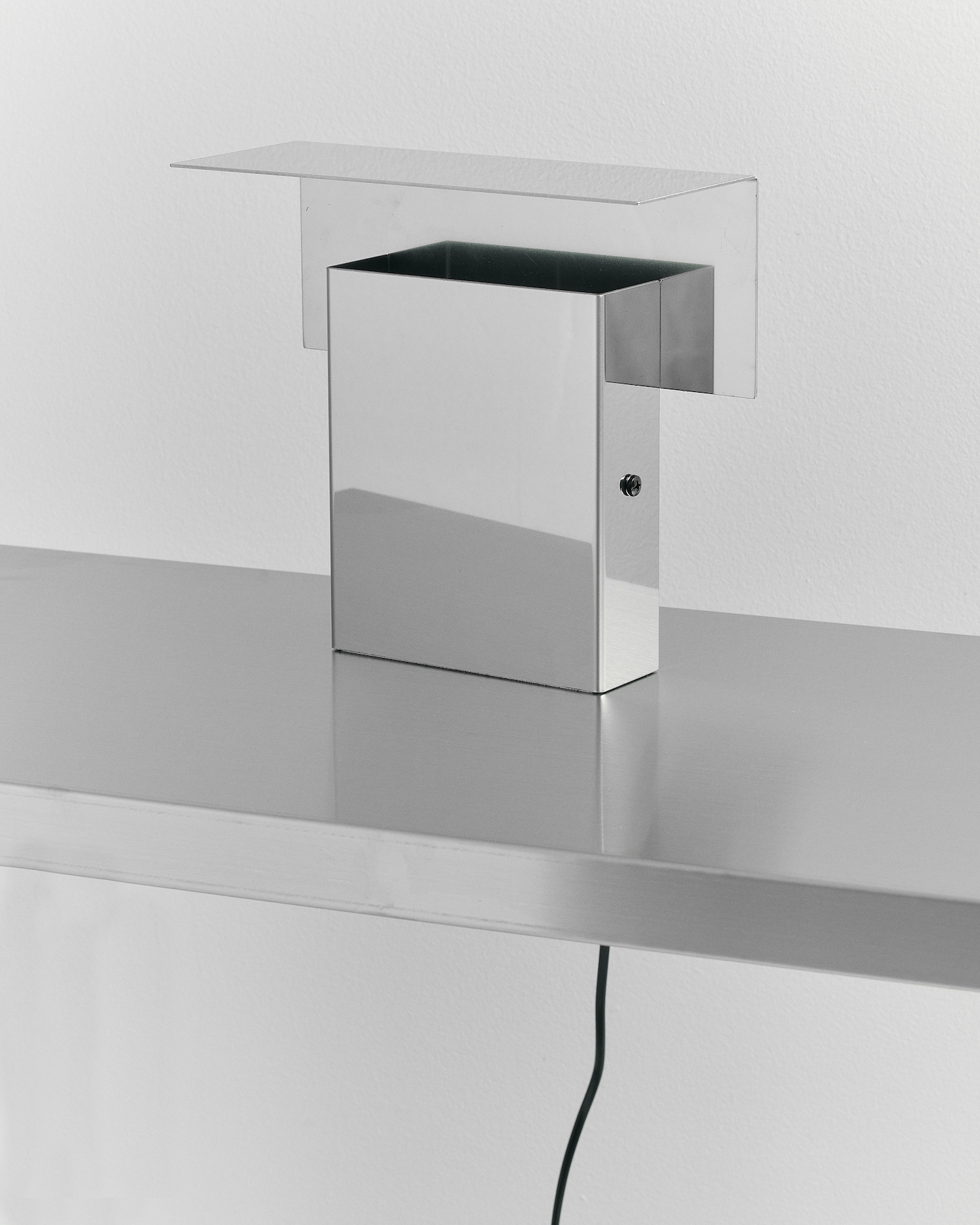 BAFFLE is a minimalist lamp designed by Melbourne-based designer Damian Tatangelo of TERMS. The lamp showcases a functional, minimalist design crafted from stainless steel. The lamp features two interlocking steel shrouds that are ingeniously folded; a significant fold in the back panel acts as a large planar reflector. This design effectively clamps the light, directing it downward onto the surface below. While BAFFLE stands out as a highly sculptural piece, its aesthetic appeal is secondary to its primary function, which is to obscure the light source and manipulate light through its geometric form. The choice of mirror steel material is deliberate, chosen for its reflective qualities to ensure a seamless transition from production to functionality. Designed to occupy minimal space, BAFFLE is ideal for use on desks or side tables where it provides indirect lighting. This lamp marks one of the initial projects from TERMS, embodying the studio’s philosophy of realizing distinct concepts through straightforward execution.