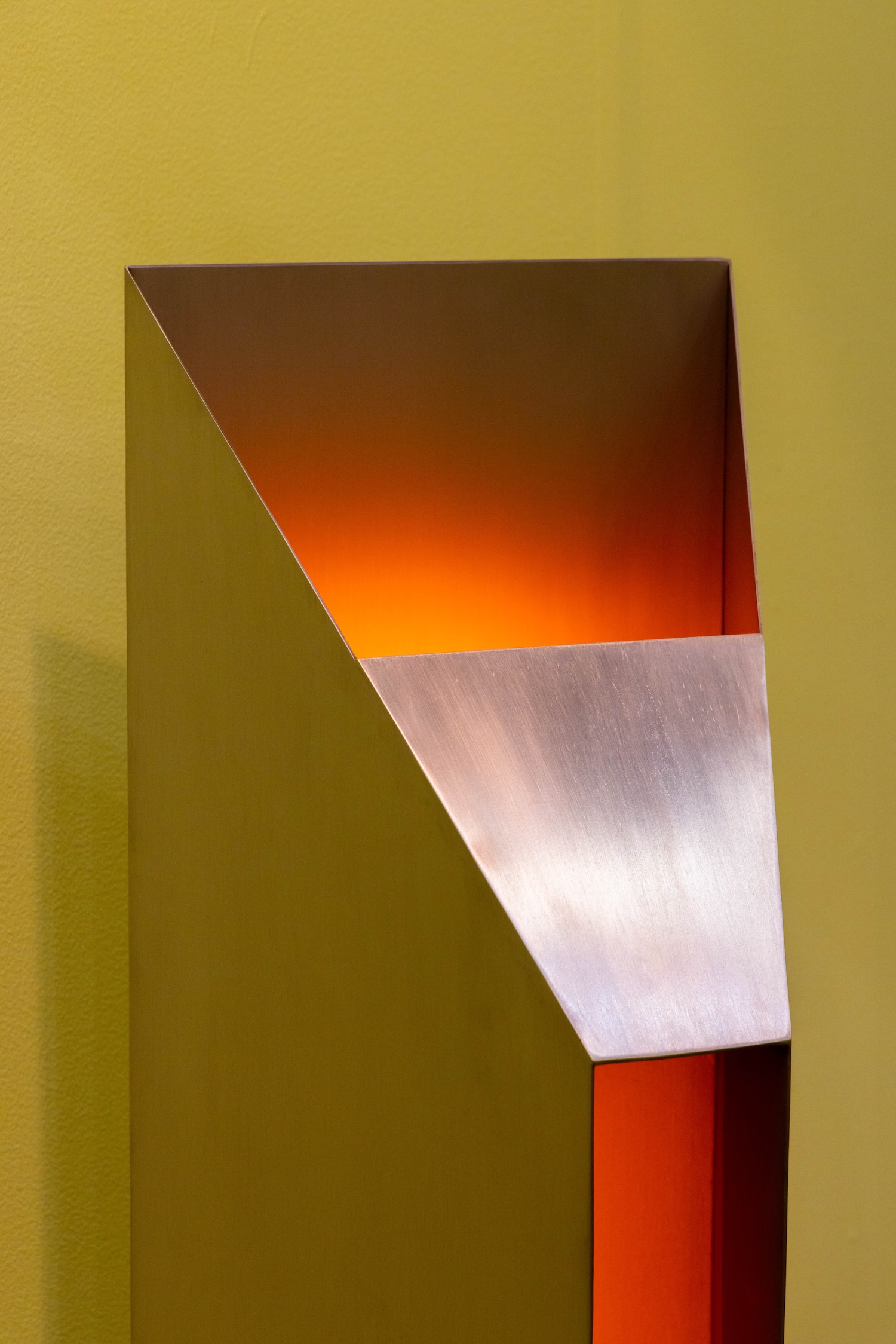 The lamp’s brutal geometry belies the delicate mastery required in its crafting. Each stainless steel plane is precisely cut and welded to create a monolithic form that appears both weightless and immovable. This duality captures the essence of metalworking itself – the transformation of an industrial material into something that approaches the ethereal.