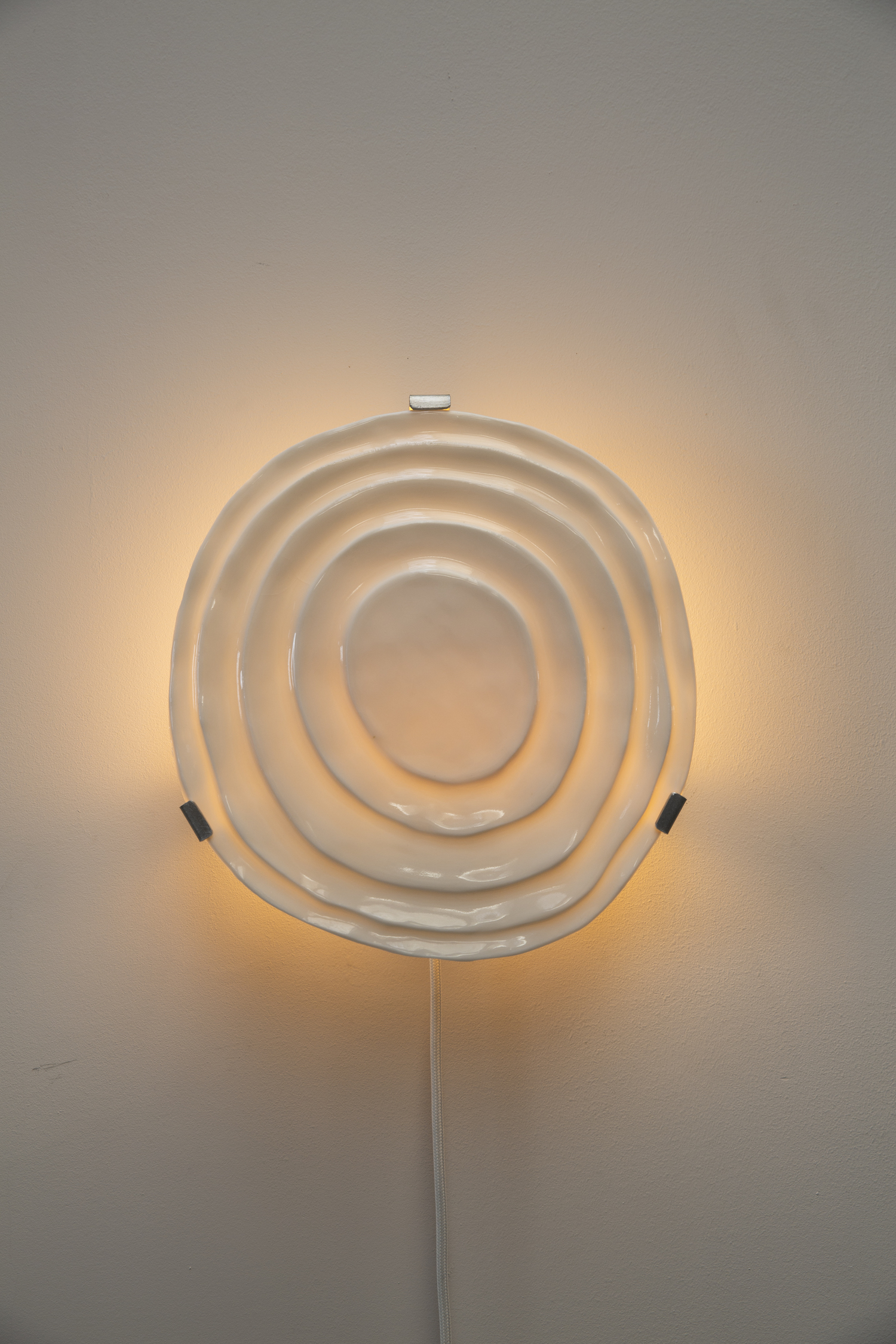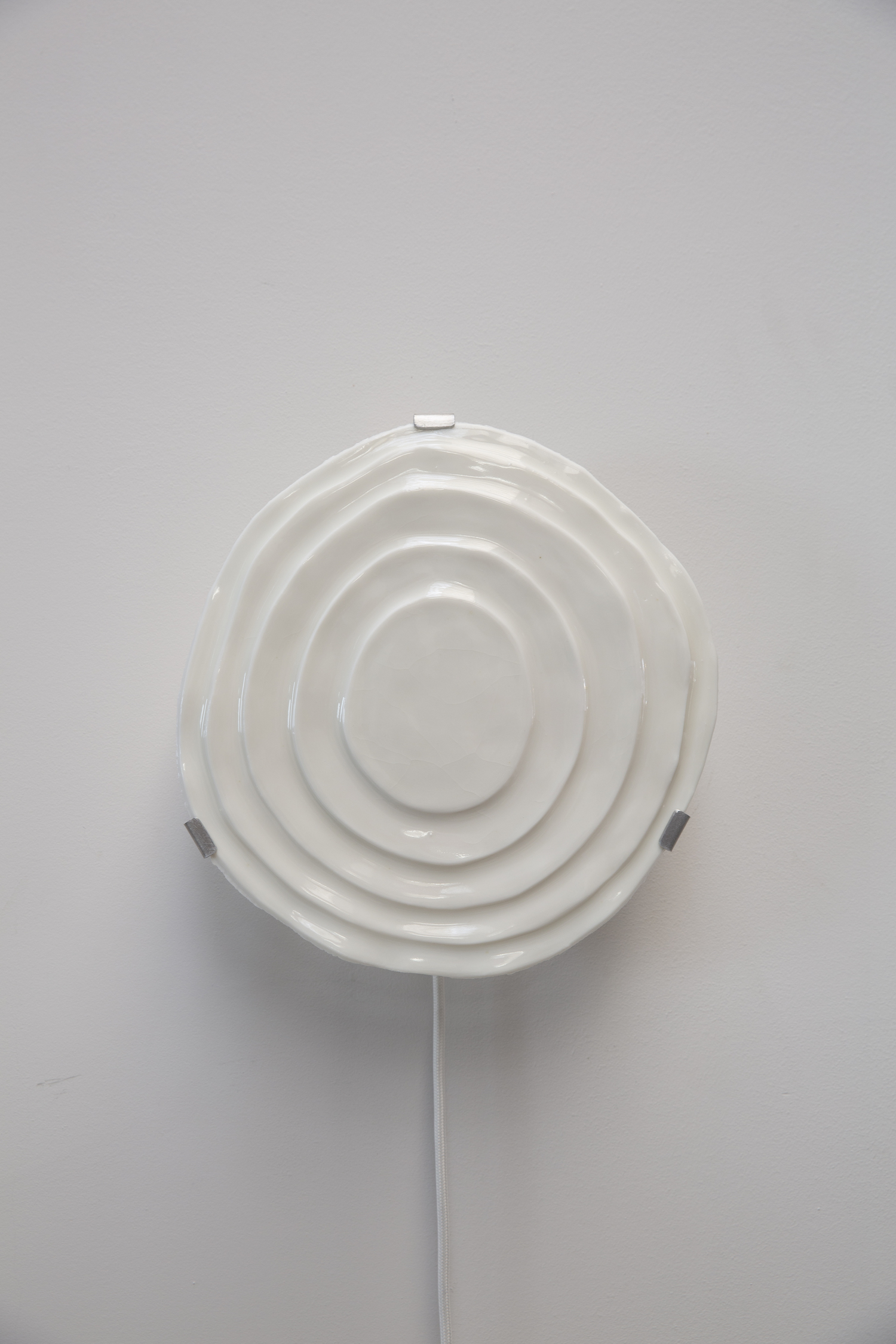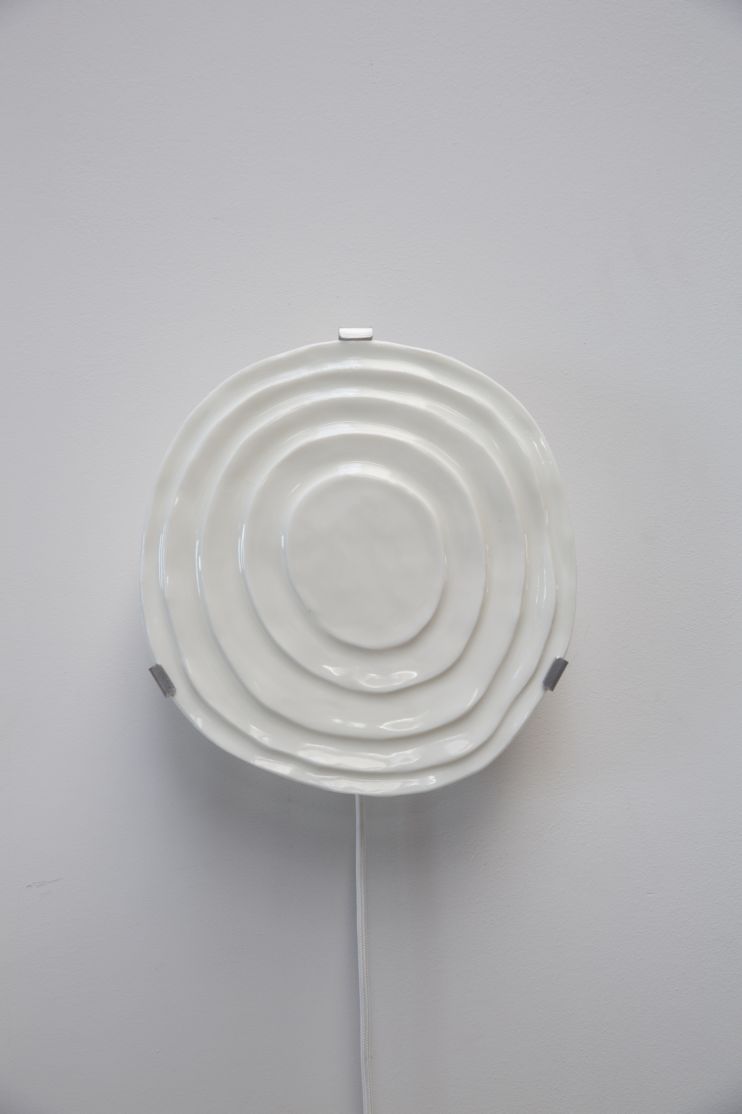 The Mark Lamp is made from thin porcelain plates, with the material’s varying levels of transparency allowing light to illuminate the material in captivating ways. To provide support for the light, an aluminum wall frame cradles the plates, offering a subtle material contrast.