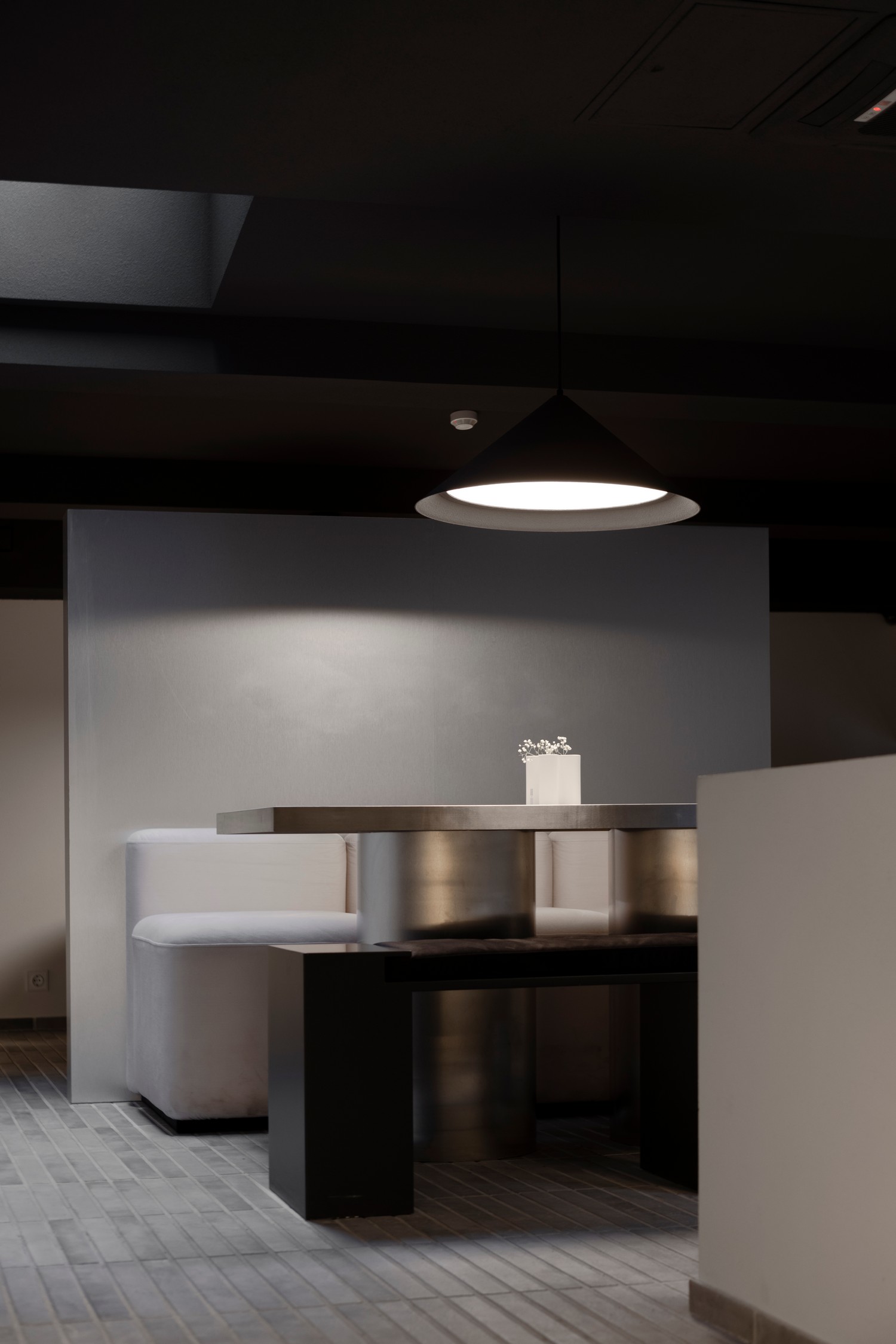 Iskra is a minimal restaurant located in Minsk, Belarus, designed by ZROBIM architects. To achieve balance, the architects opted for a contrast in finishes. On the first floor, dark graphite tones prevail, enhanced by translucent lighting elements that float near the ceiling. General lighting is minimized in favor of targeted illumination over tables and the bar, ensuring each dish is well-lit and visually appealing. The second floor takes the opposite approach, with white walls and a darkened ceiling evoking the impression of a “dark sky.” Metal details—thin pipes, table edges, and minimalist arches—reference the building’s industrial past. The bar and kitchen areas employ metal surfaces that resemble a production line, while small-format clinker tiles soften the setting and add warmth underfoot.