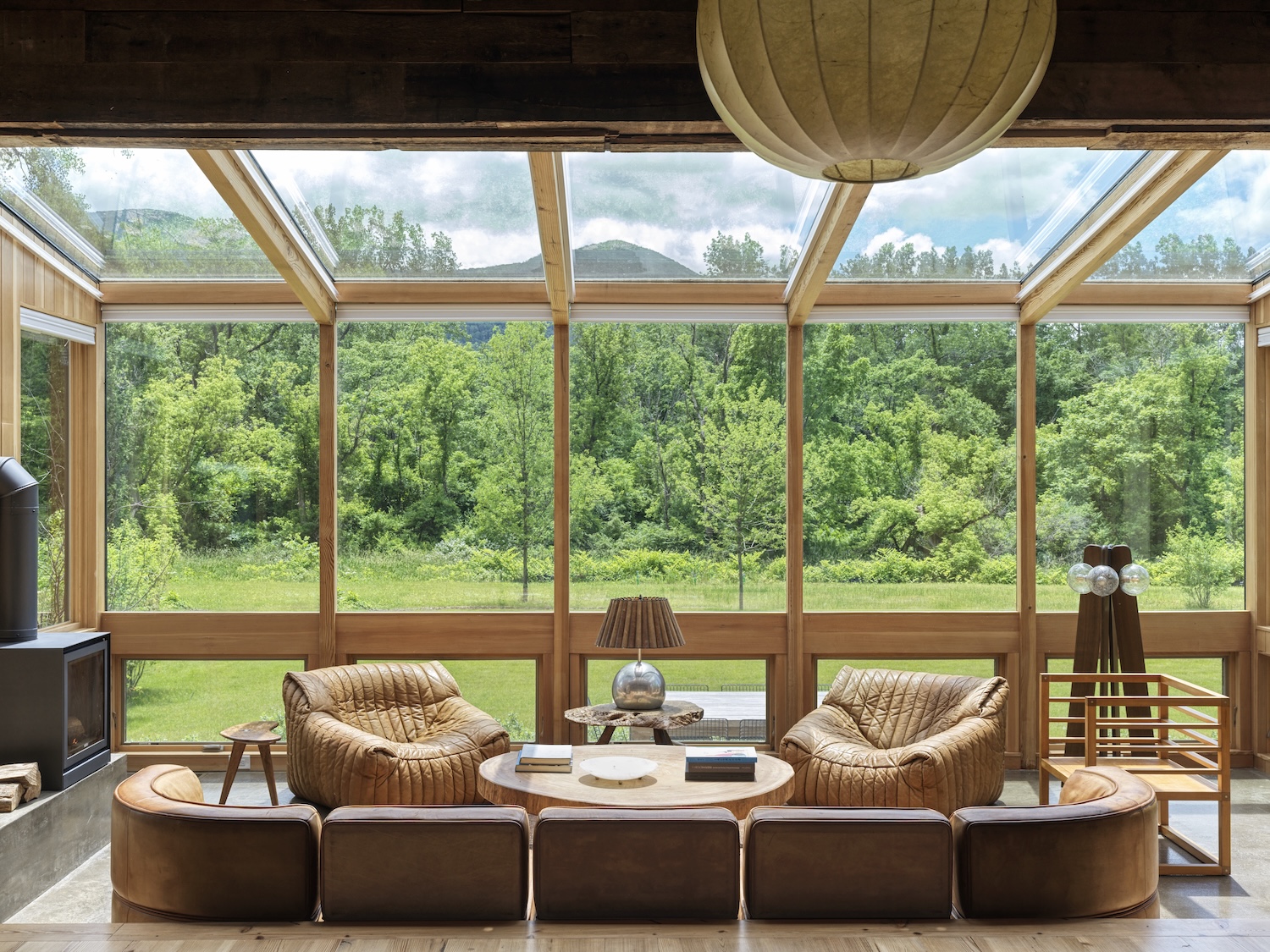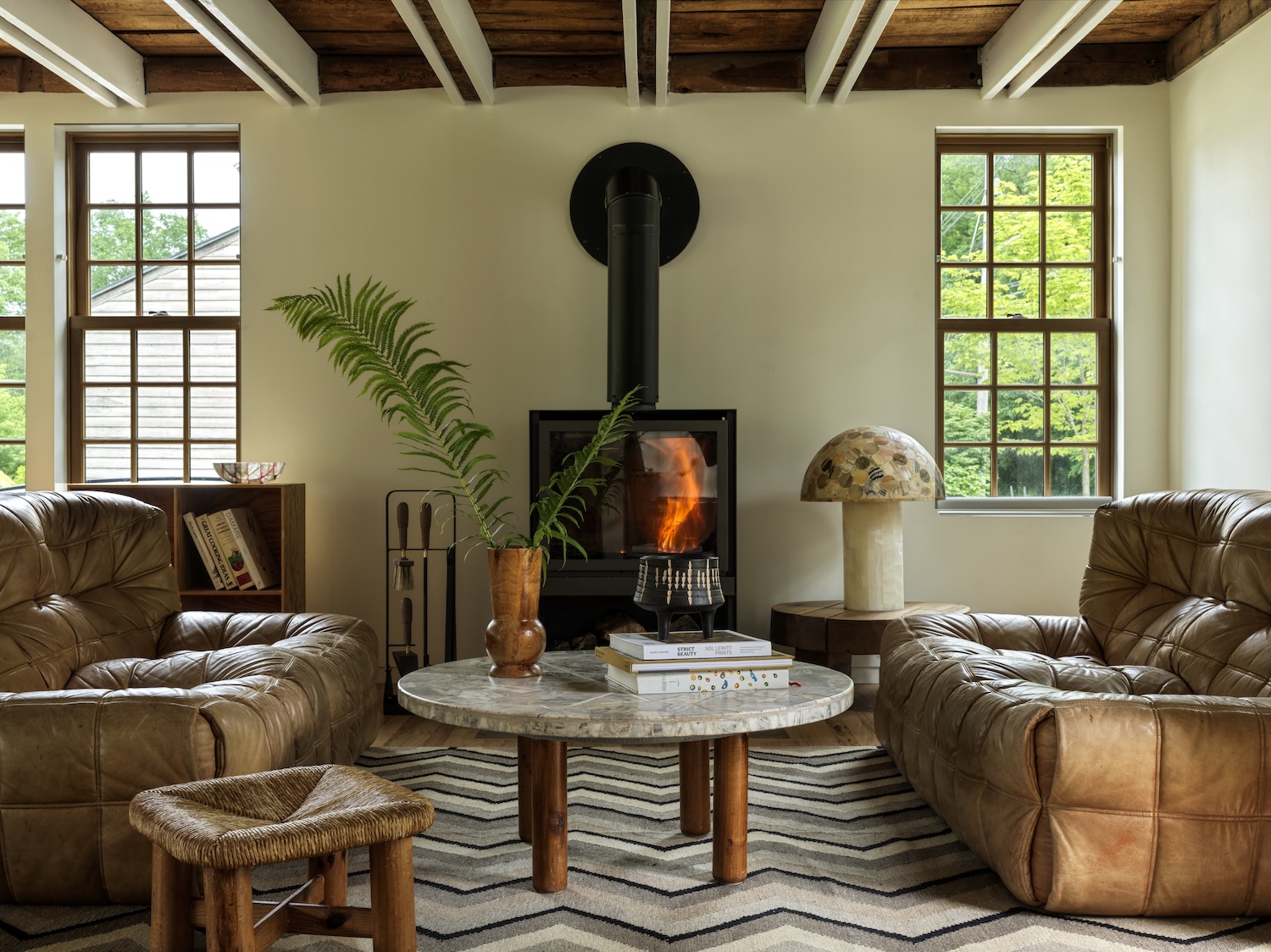 The lounge spaces within the property tell a compelling story about the evolution of American hospitality design. In the renovated 1813 farmhouse, now known as The Airport Rooms, the interiors strike a delicate balance between preservation and innovation. Here, daybed seating areas are thoughtfully positioned to frame views of the surrounding landscape, creating intimate conversation spaces that feel both contemporary and timeless.